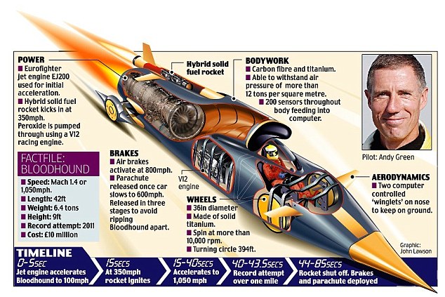 The project’s driver hopes it will inspire a generation of young people. How it will work: The Bloodhound project, backed by the Ministry of Defence, aims to smash the land speed record. The man behind the wheel of the rocket-propelled machine – Wing Commander Andy Green from the Royal Air Force – hopes children will become scientists and mathematicians after watching him power to 1.4 times the speed of sound. The 50-year-old former Phantom and Tornado pilot holds the record after he drove the Thrust Supersonic car to 763mph in 1997. ‘Now 15 years later, we’re running an education programme called Bloodhound to break that record and share the technology with a whole generation of young people,’ he said. ‘This is much bigger than just another land speed record.’