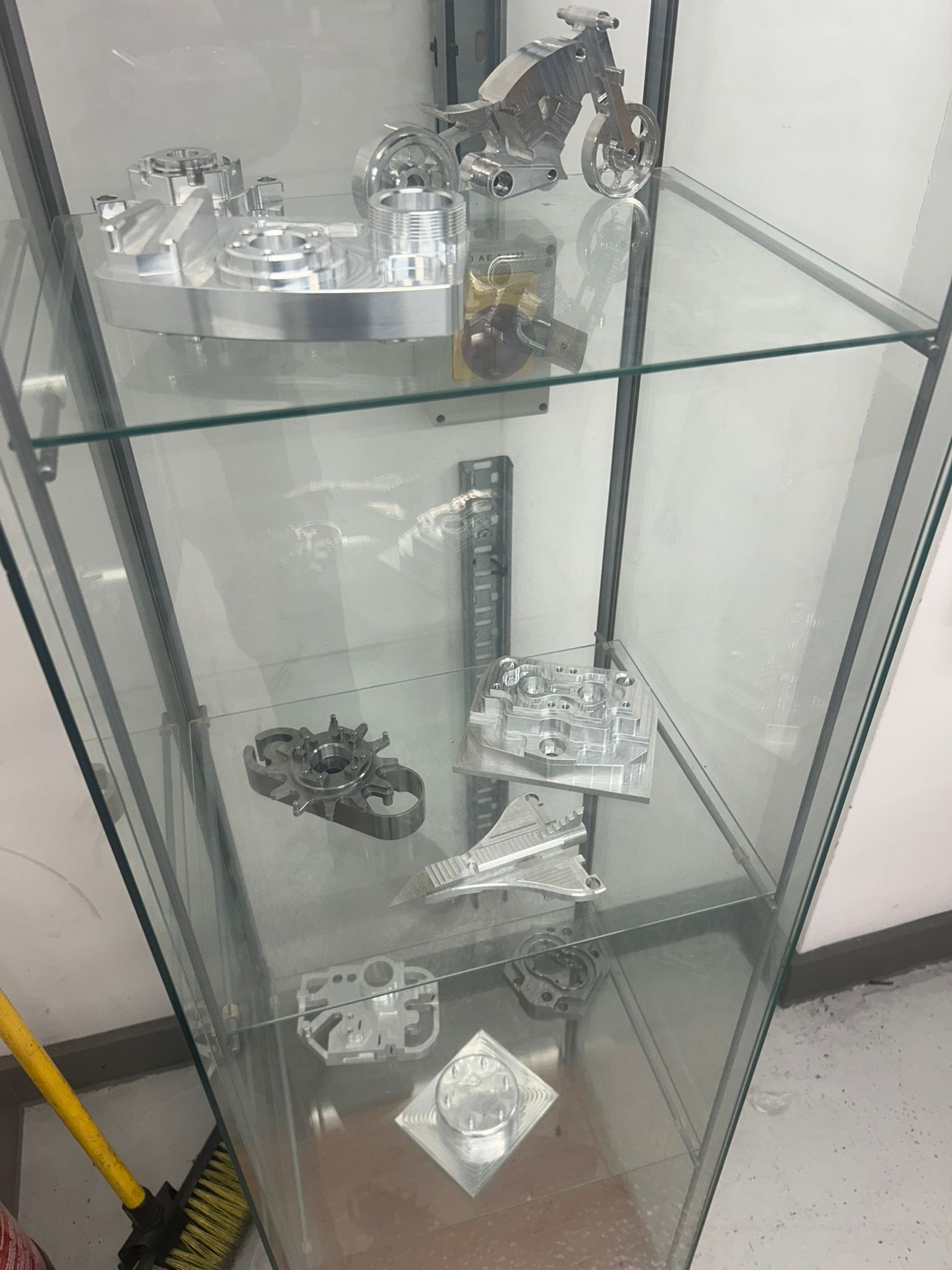 The glass cabinet in the photos was in the foyer at college. It was full of junk made by the students and rather than being shiny well-made parts it was a load of rusty junk, which said a lot…. Cameron says it is now shiny junk instead ! ”
