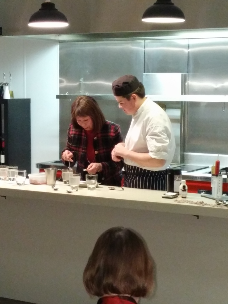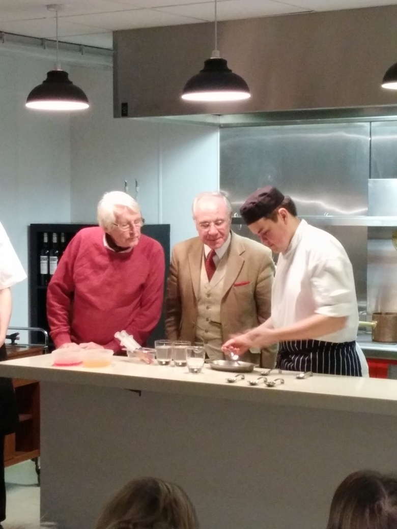 Well, for those of you that could not make this Ladies’ evening you missed a cracker ! The evening started with a talk from the head chef who presented two of his students who were going to do the live cooking. There were three different types of cooking presentation all based on ‘Spherification’. After the chefs showed how it was done volunteers were called to have a go while, much to our delight, samples were brought around to try. Wow ! What a taste sensation.