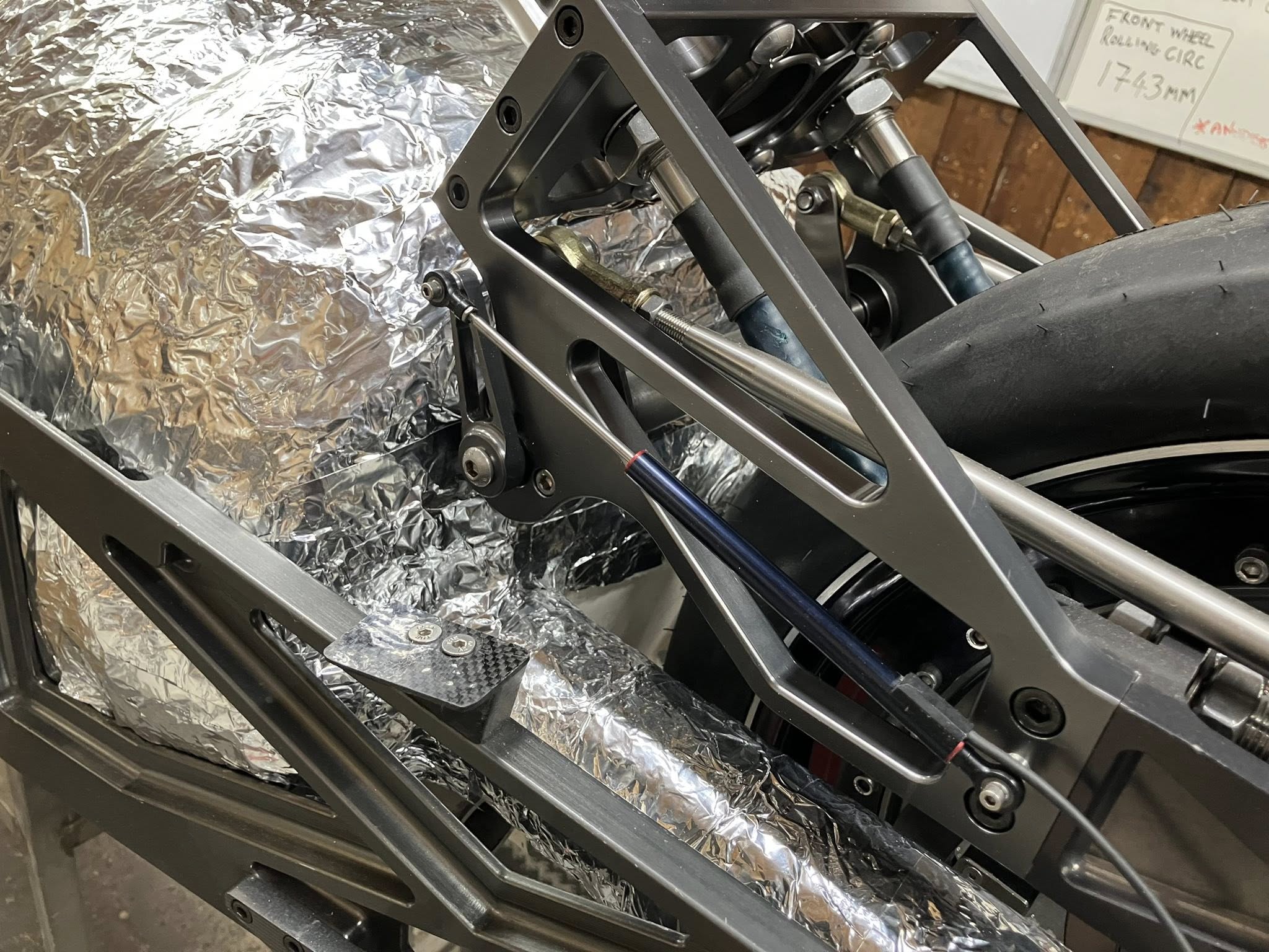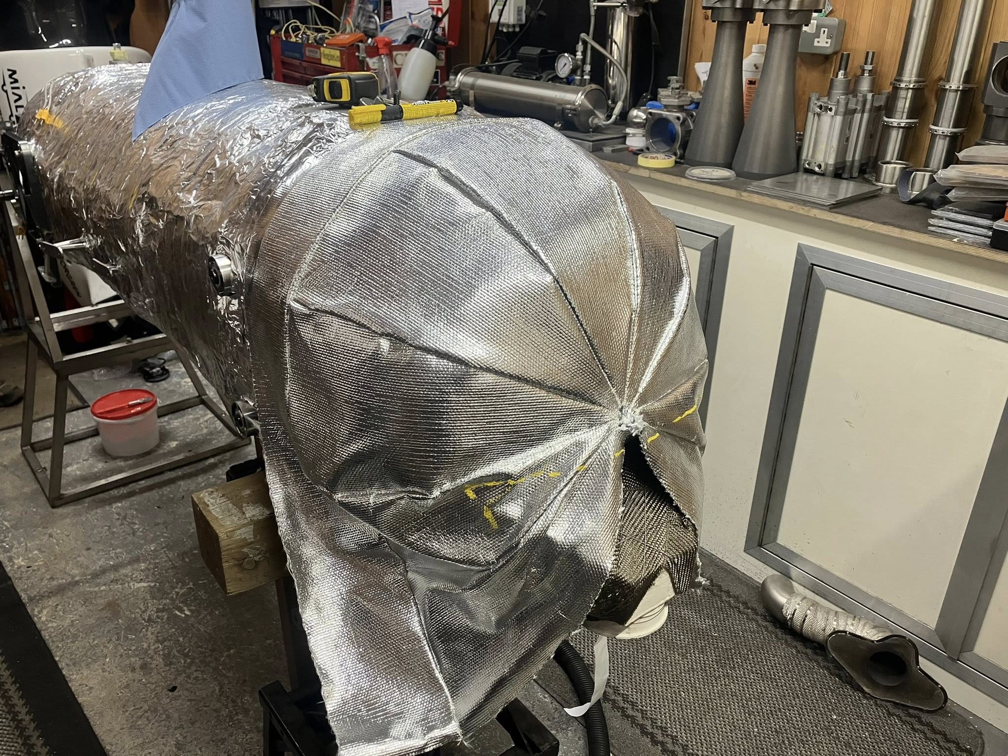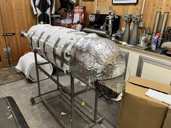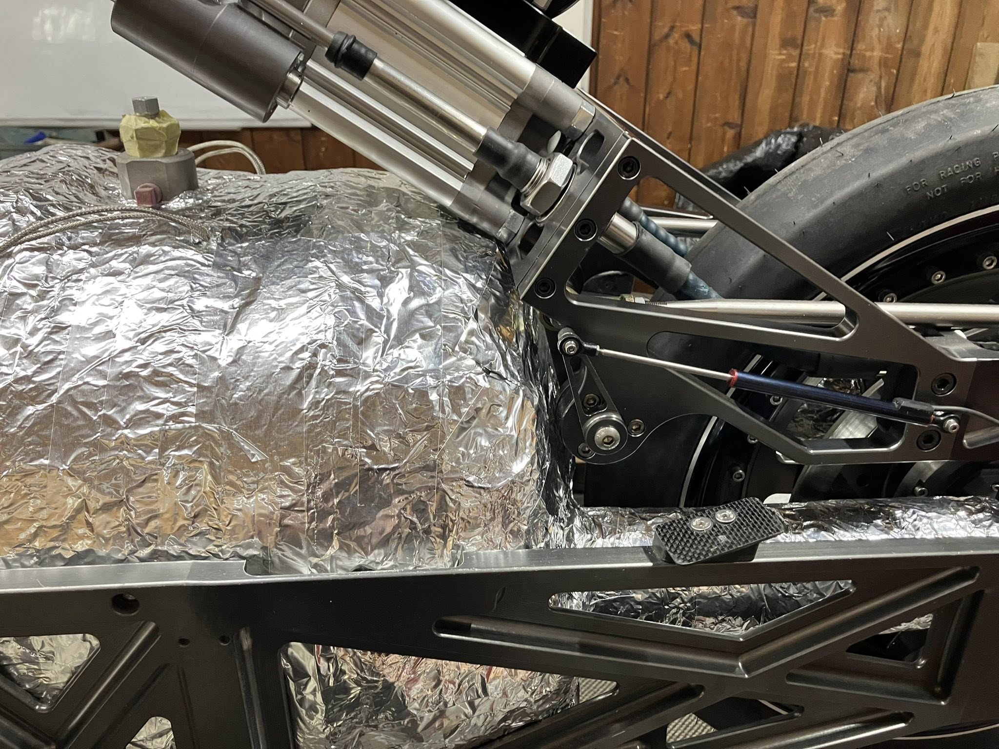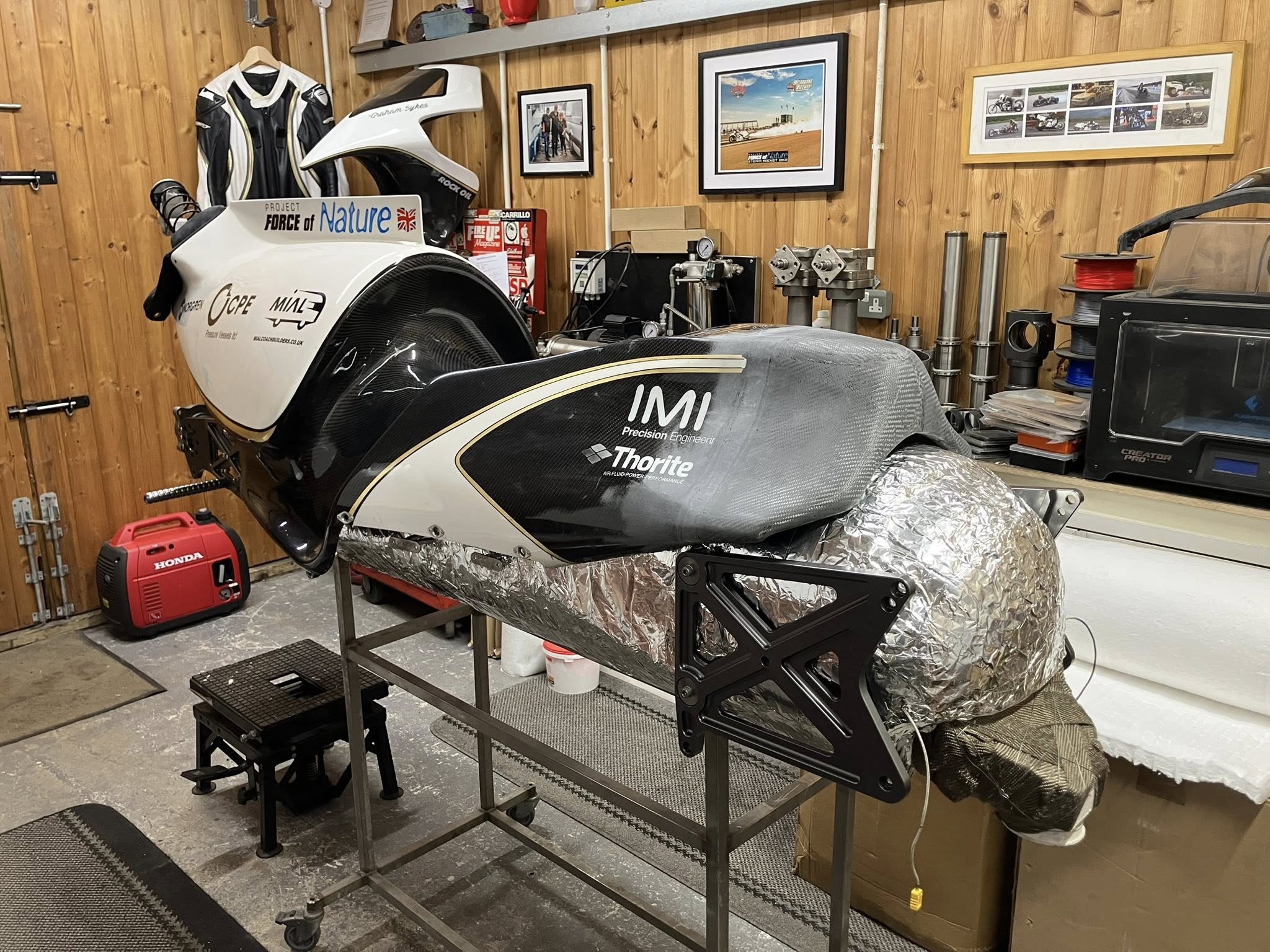 “Lots are going on in the background and even more going on in the workshop since the last update. The vessel is now complete and fully ceramic painted. The front double skin heating manifold is now complete and wrapped with Basalt insulation. The rear heater manifolds are now machined and fitted as well as the new design turbulators fitted into the heater tubes. The rear heater exhausts are now all fabricated and fitted and the ceramic insulation is now all fitted to the vessel and foil taped. The new insulation cover is being made from 1.2mm Aluminium glass fibre cloth. All sewn with 0.9 mm Kevlar thread. Diane is well on with this and has taken over the dining room machining the new cover! On top of all this the new re designed bodywork is now back from Hansell composites and it all fits well. Next is to finish machine the handle bar upright mounts and front damper mounts to fit the front end onto the new vessel. That’s next weeks work laid out and brings the build back on track. So this weeks work has been mainly about insulation. Keeping the water hot in the tank is key to power. The heat energy is the power not the pressure. We need the pressure to achieve the water temperature required 250 deg C 40 Bar. Even though I am still working full time running my own engineering business, I am managing to work on the rocket around 50 hours a week to try and get the bike ready for its first test in March. Long hours with early starts and late finishes. I cannot tell a lie it’s taking it out of me both financially and energy, but all this effort will be worth it and all this work will soon be history and the stepping stones that have to be passed to achieve our goals will be have been all worth it . More updates shortly. Thanks for following and please make yourselves known this year at meetings.”