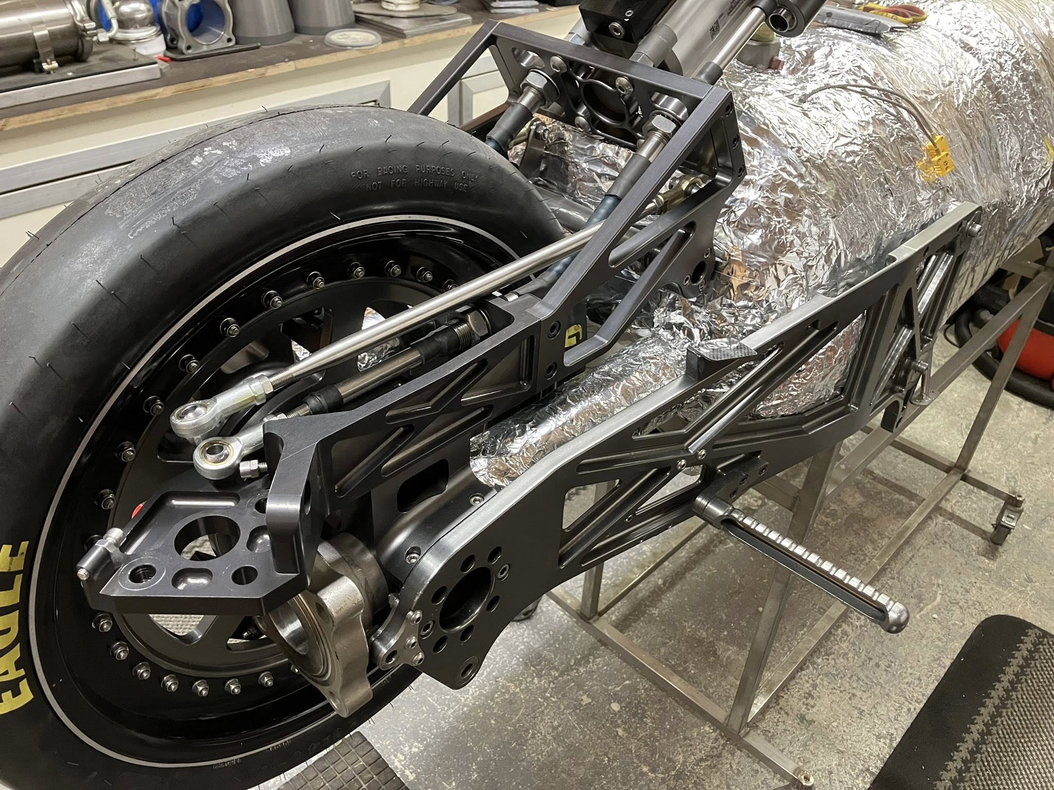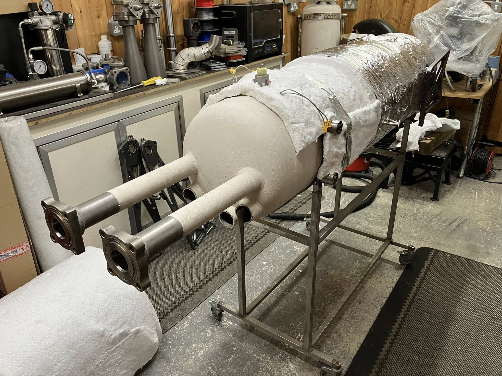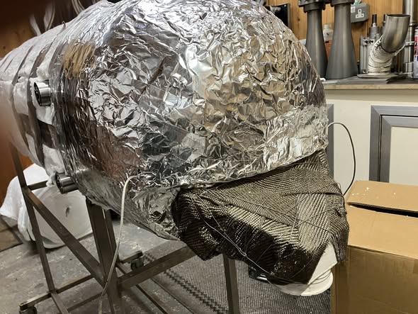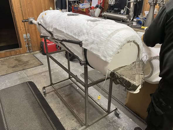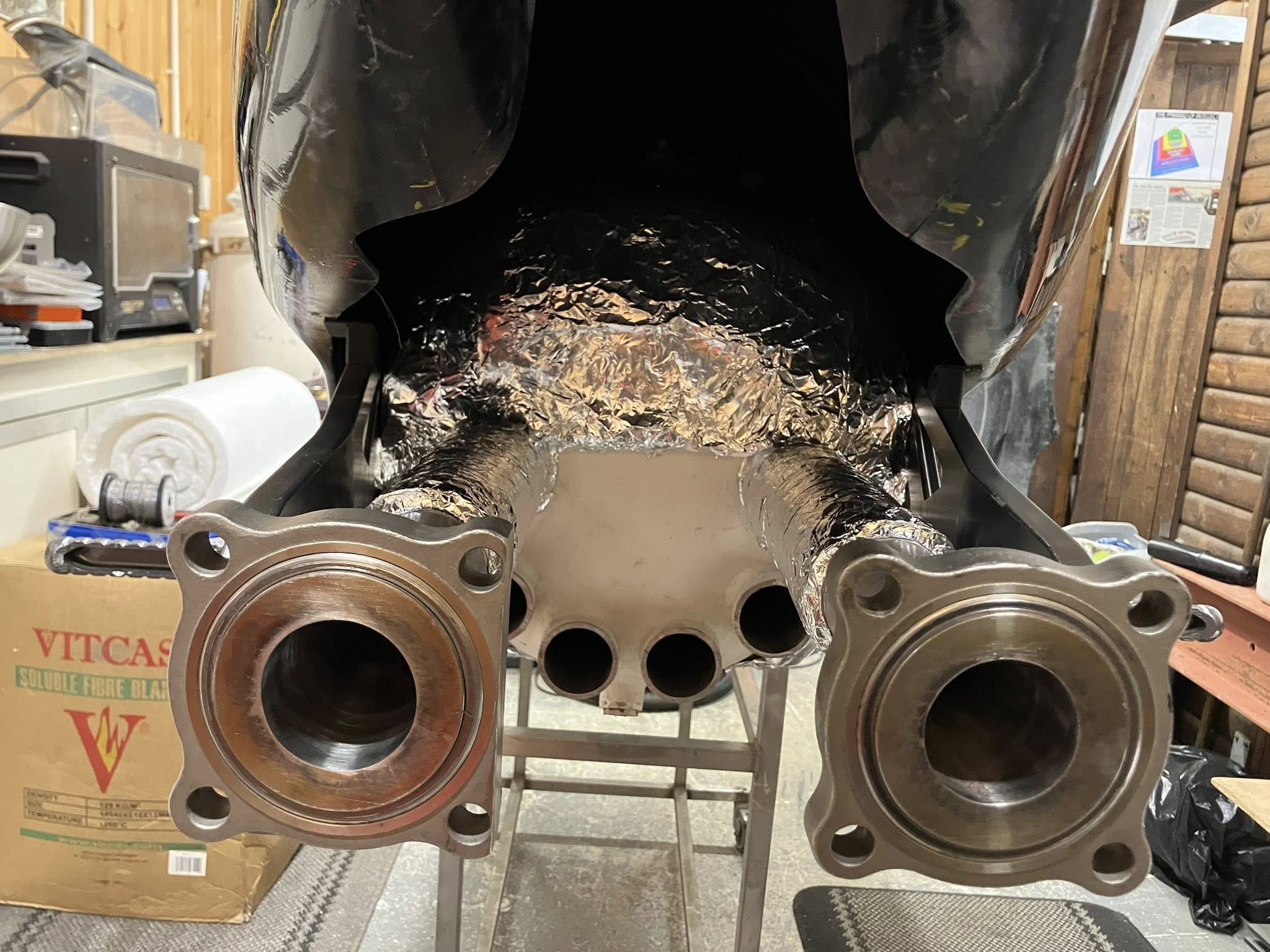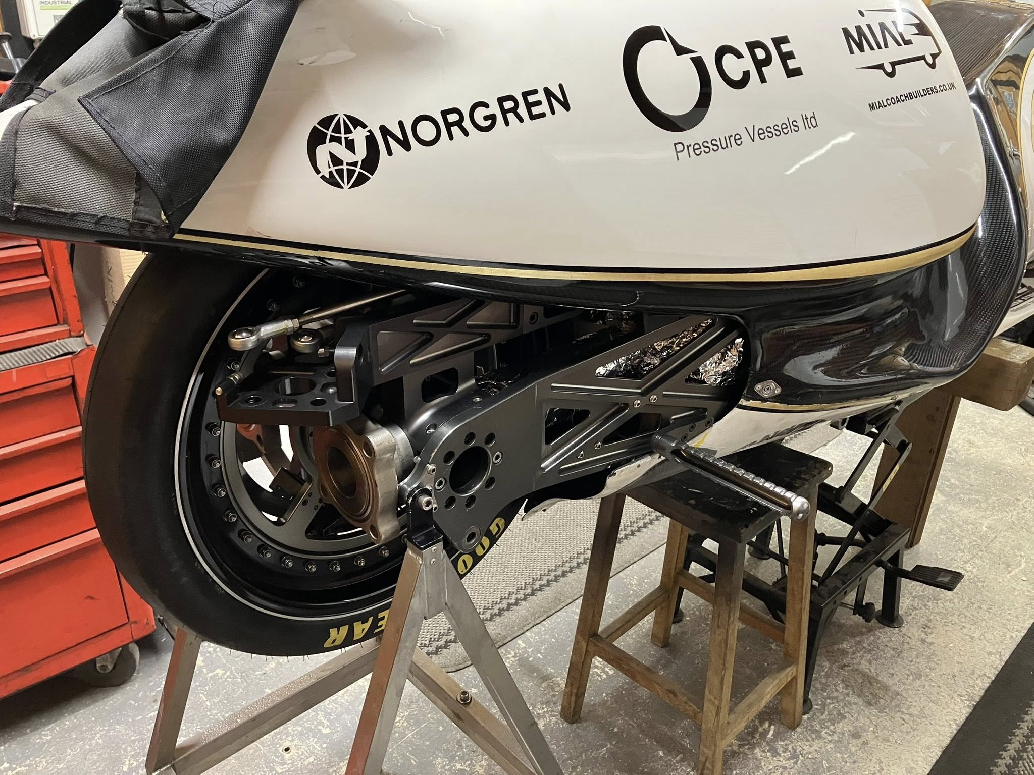 “Lots are going on in the background and even more going on in the workshop since the last update. The vessel is now complete and fully ceramic painted. The front double skin heating manifold is now complete and wrapped with Basalt insulation. The rear heater manifolds are now machined and fitted as well as the new design turbulators fitted into the heater tubes. The rear heater exhausts are now all fabricated and fitted and the ceramic insulation is now all fitted to the vessel and foil taped. The new insulation cover is being made from 1.2mm Aluminium glass fibre cloth. All sewn with 0.9 mm Kevlar thread. Diane is well on with this and has taken over the dining room machining the new cover! On top of all this the new re designed bodywork is now back from Hansell composites and it all fits well. Next is to finish machine the handle bar upright mounts and front damper mounts to fit the front end onto the new vessel. That’s next weeks work laid out and brings the build back on track. So this weeks work has been mainly about insulation. Keeping the water hot in the tank is key to power. The heat energy is the power not the pressure. We need the pressure to achieve the water temperature required 250 deg C 40 Bar. Even though I am still working full time running my own engineering business, I am managing to work on the rocket around 50 hours a week to try and get the bike ready for its first test in March. Long hours with early starts and late finishes. I cannot tell a lie it’s taking it out of me both financially and energy, but all this effort will be worth it and all this work will soon be history and the stepping stones that have to be passed to achieve our goals will be have been all worth it . More updates shortly. Thanks for following and please make yourselves known this year at meetings.”