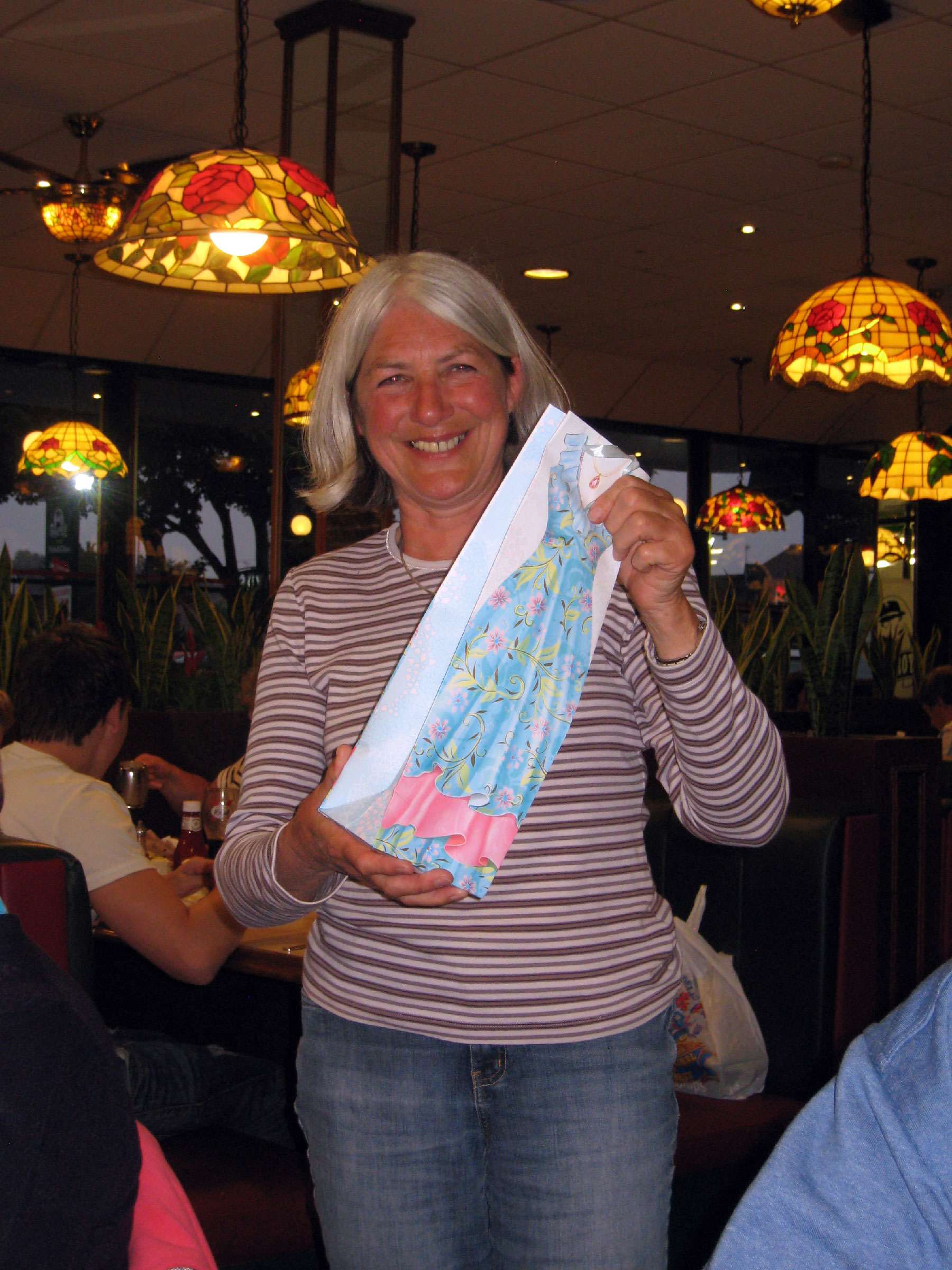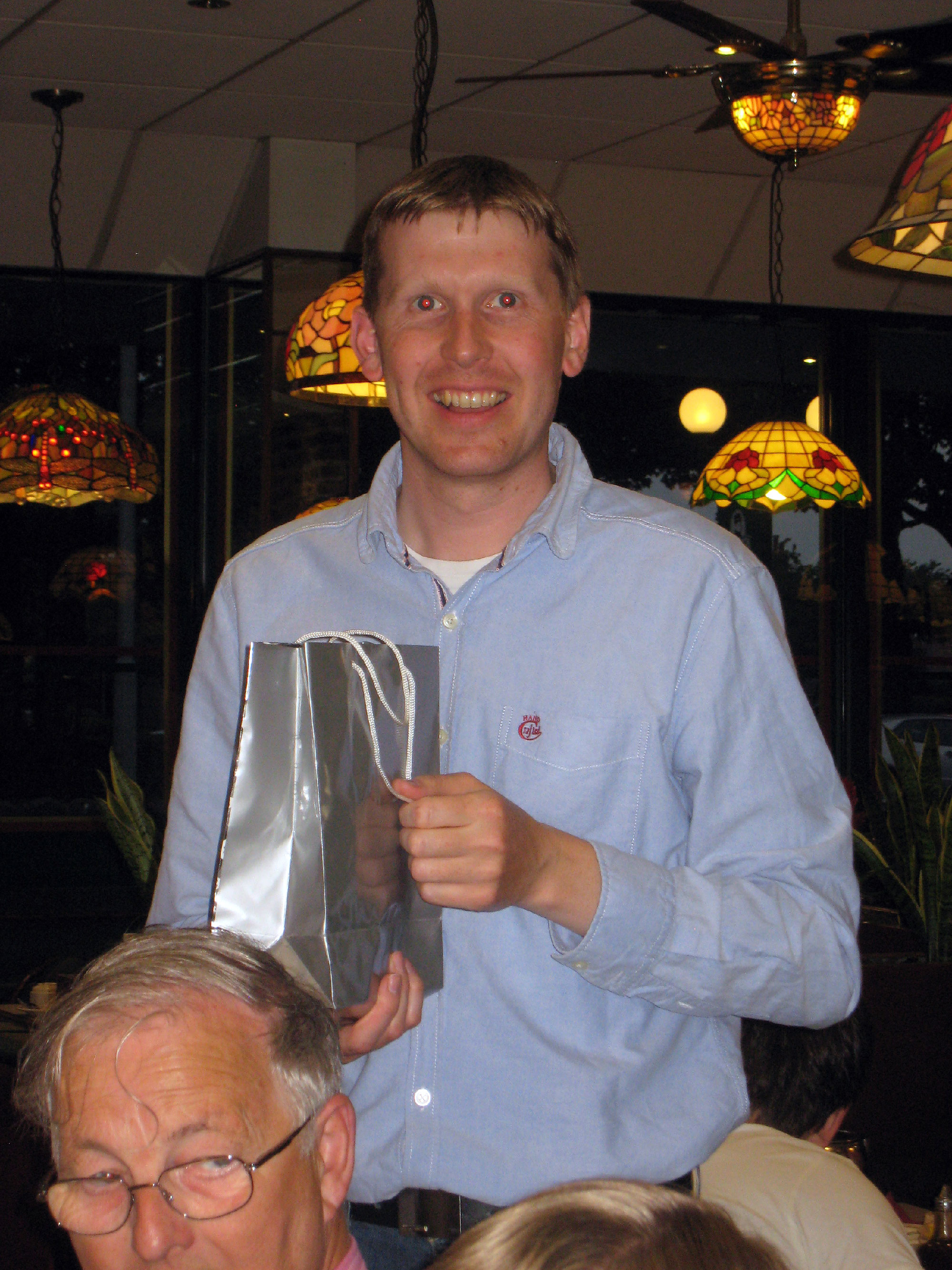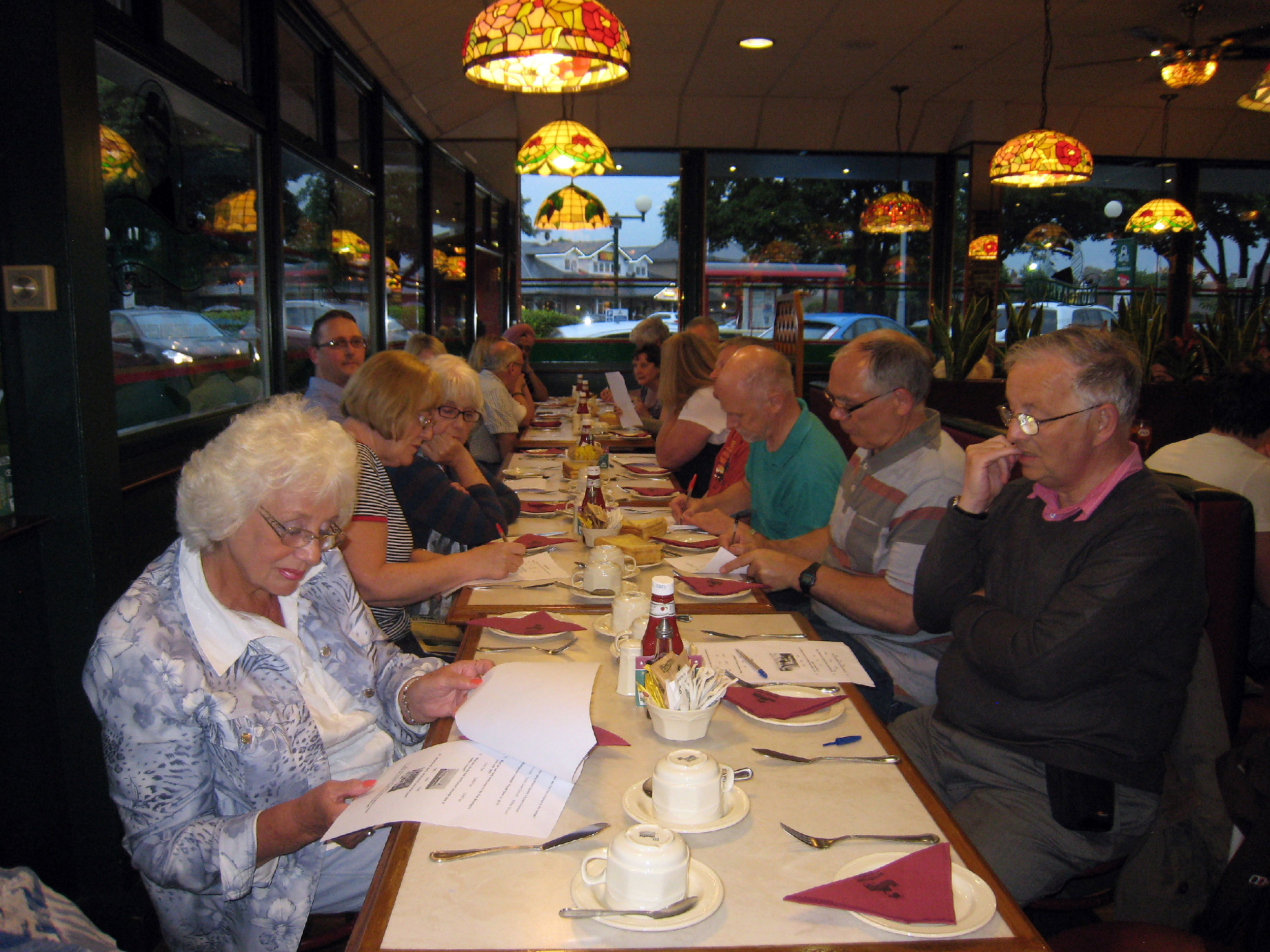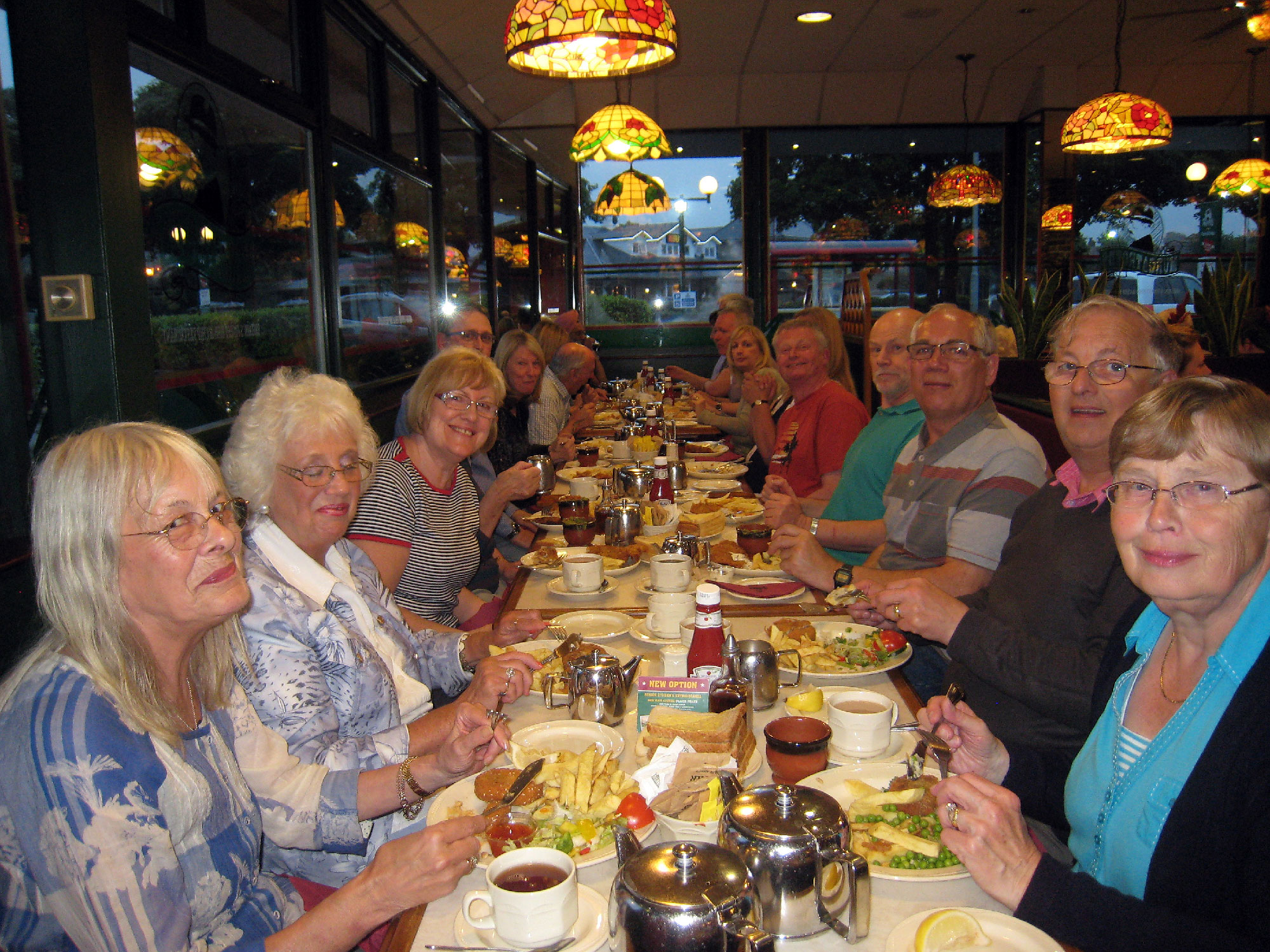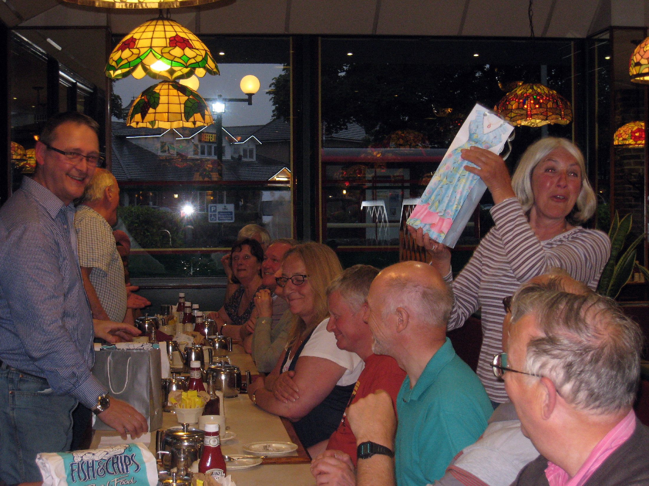 Appetites had grown following the walk and field athletics and so we retired to Murgatroyds for supper. Malcolm Murray had produced a quiz all about Yeadon Tarn and handed around the quiz sheets to be completed during the meal. Hearty portions of delicious Fish and Chips were consumed prior to prize giving. Quiz sheets were checked and the results announced. First prize in the quiz was received by Jane Brown whose team mate was Barrie Yates. Howard Kingswell was presented with a prize for winning the Frisbee Competition. Well done to the winners !